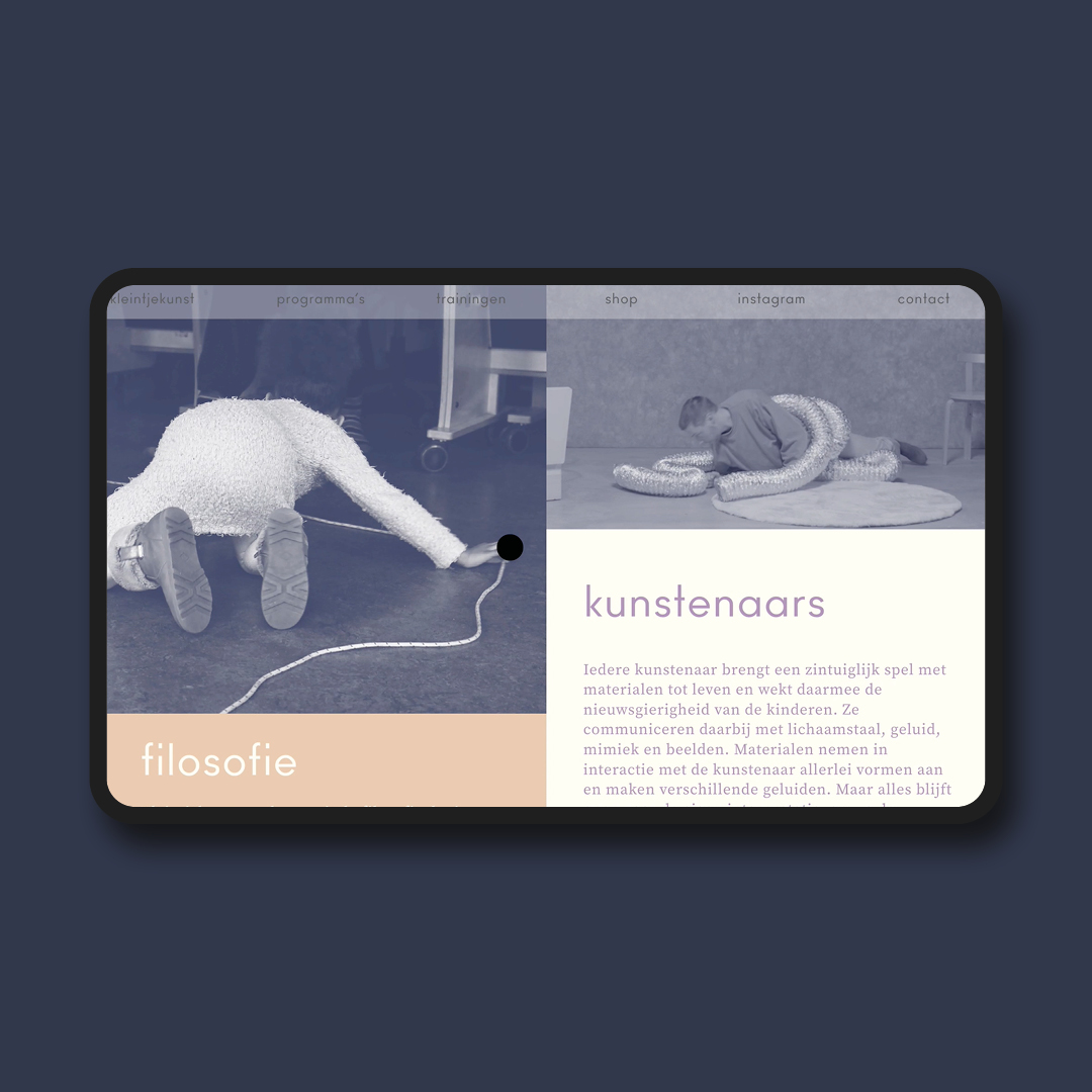 Website design for Kleintjekunst, an organisation who develop interactive art programmes for young children. Guided by artists, the children develop their imagination and creativity through performances and workshops.